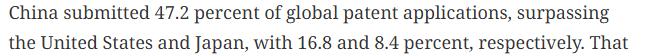文章称,随着中国在全球专利申请量中占据领先地位,知识产权保护已成为中国发展议程中的核心战略支柱。文章援引世界知识产权组织(WIPO)发布的数据称,2023年全球专利申请活动总量约为355.21万件,其中中国国家知识产权局收到的申请量超过160万件,占比为47.2%,超过了美国(16.8%)和日本(8.4%)。